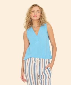 Easy Breezy. Evva is new this season in our washed double faced cotton gauze for a soft, gently crinkled feel. This sleeveless pullover top features a V-neck with bar tack details, raw edge sleeves and bottom hem, and shirred front and back yokes.