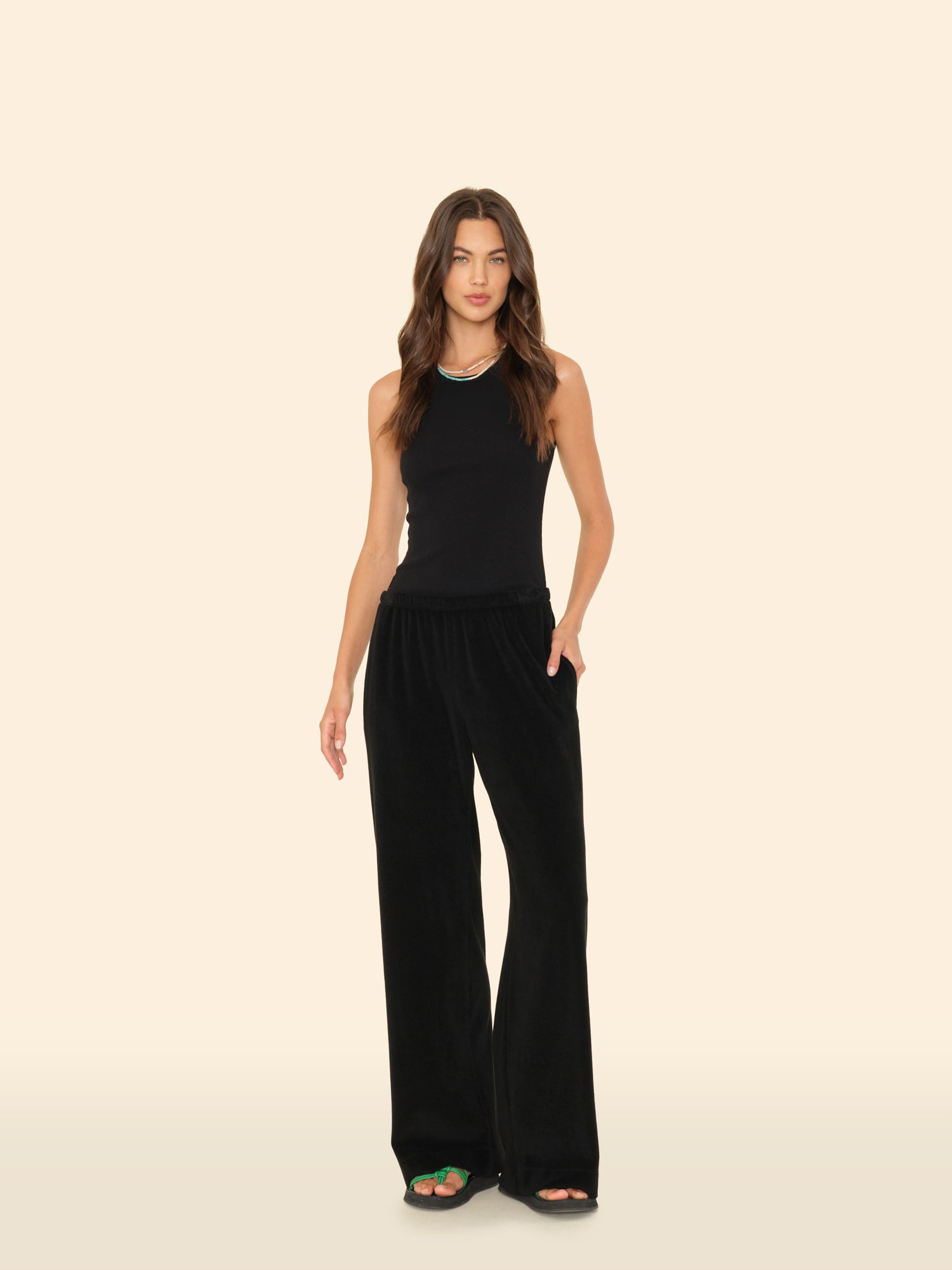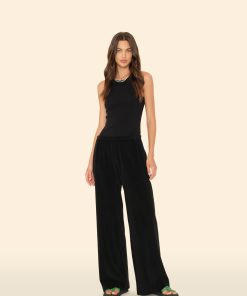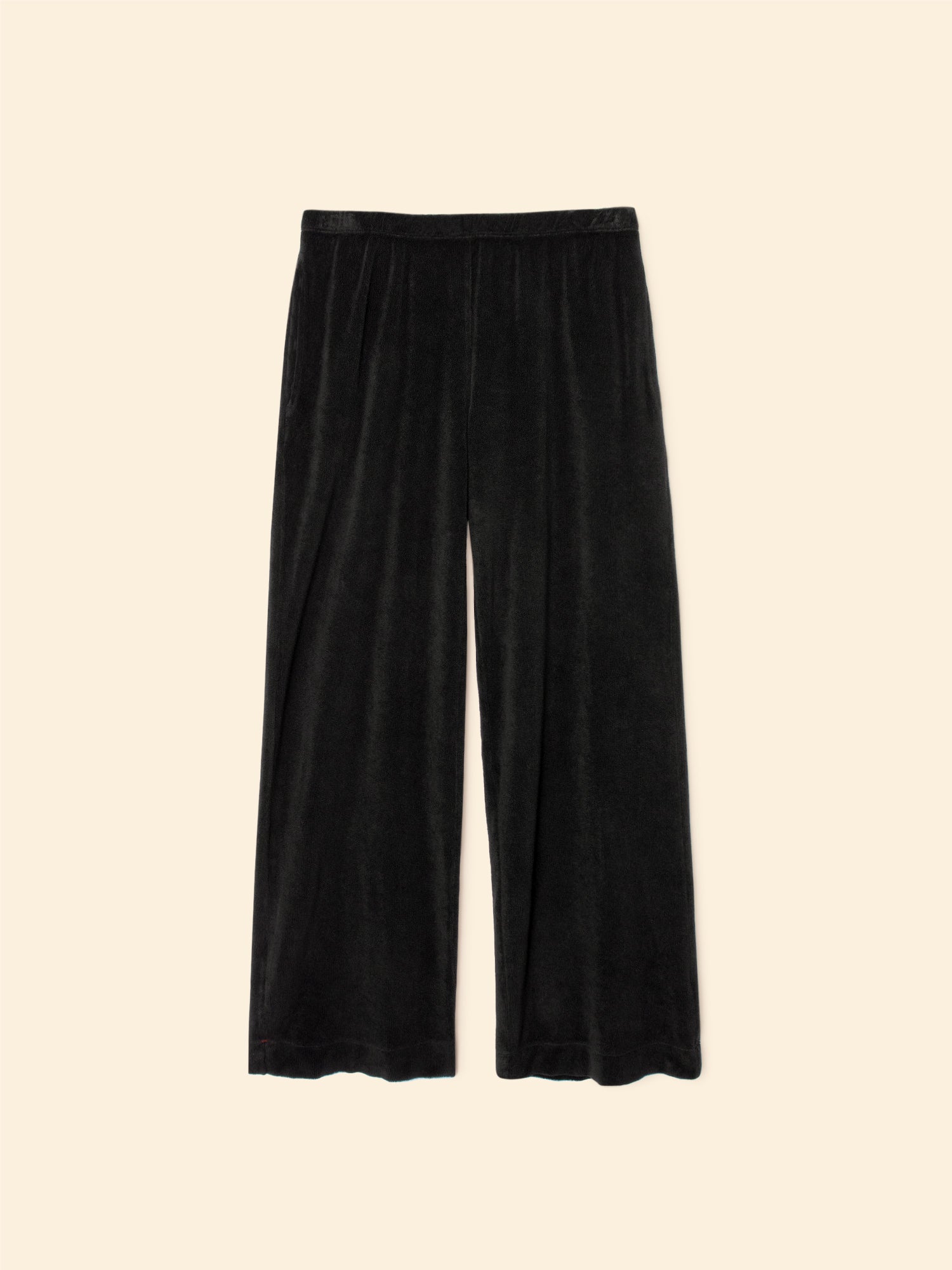 Soak up the Sun. Delany is made in our new cotton blend towel terry. Delany is a pull on sweatpant with a wide leg, elasticized waist, and side seam pockets.