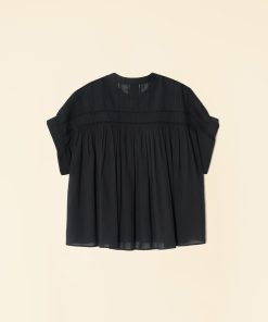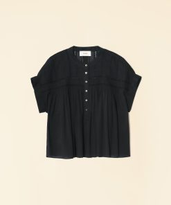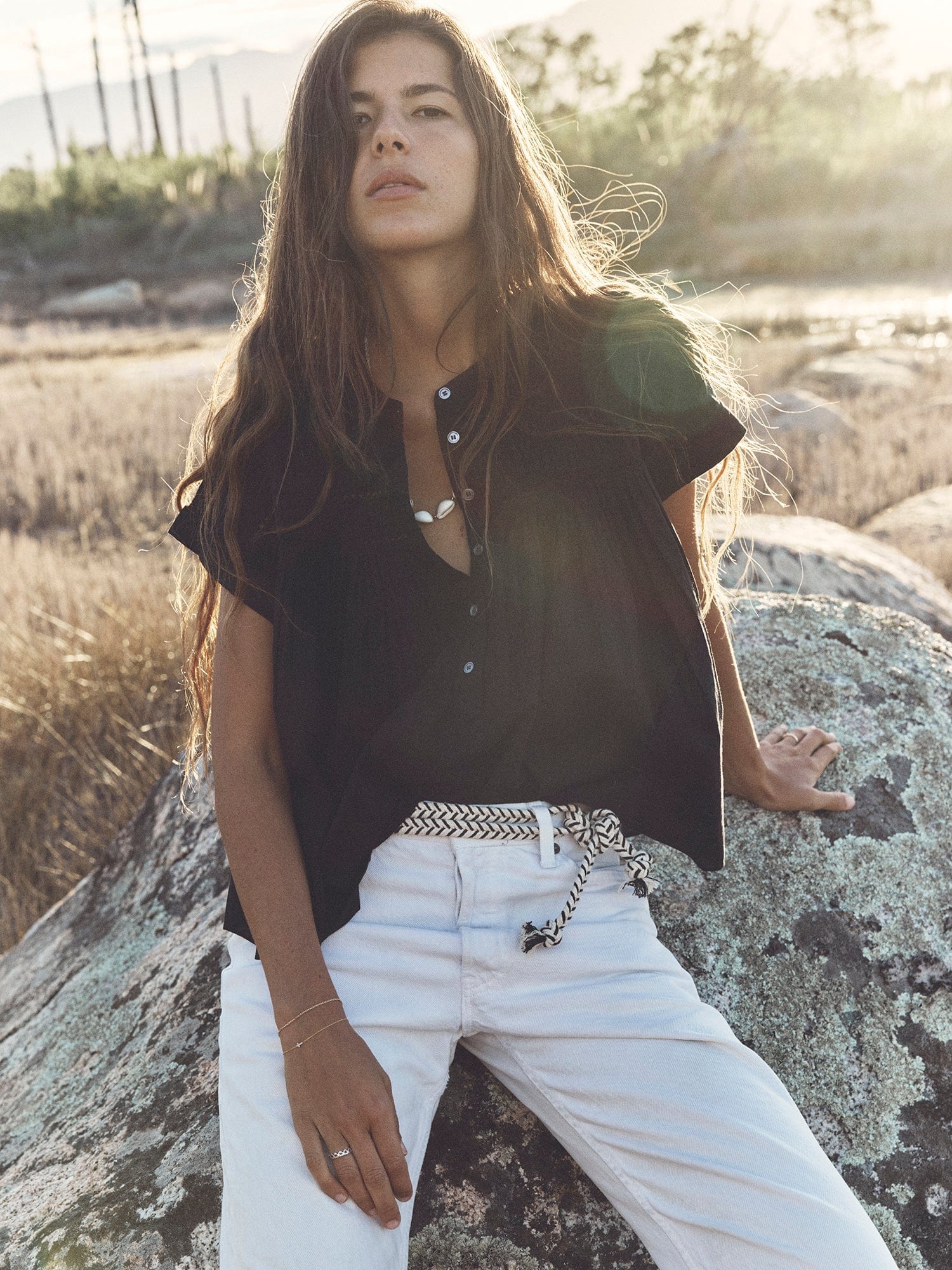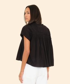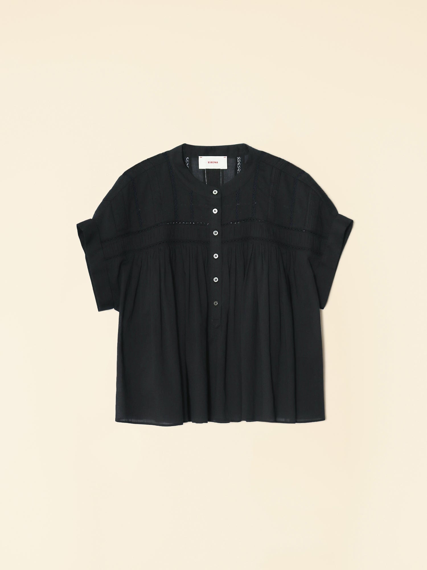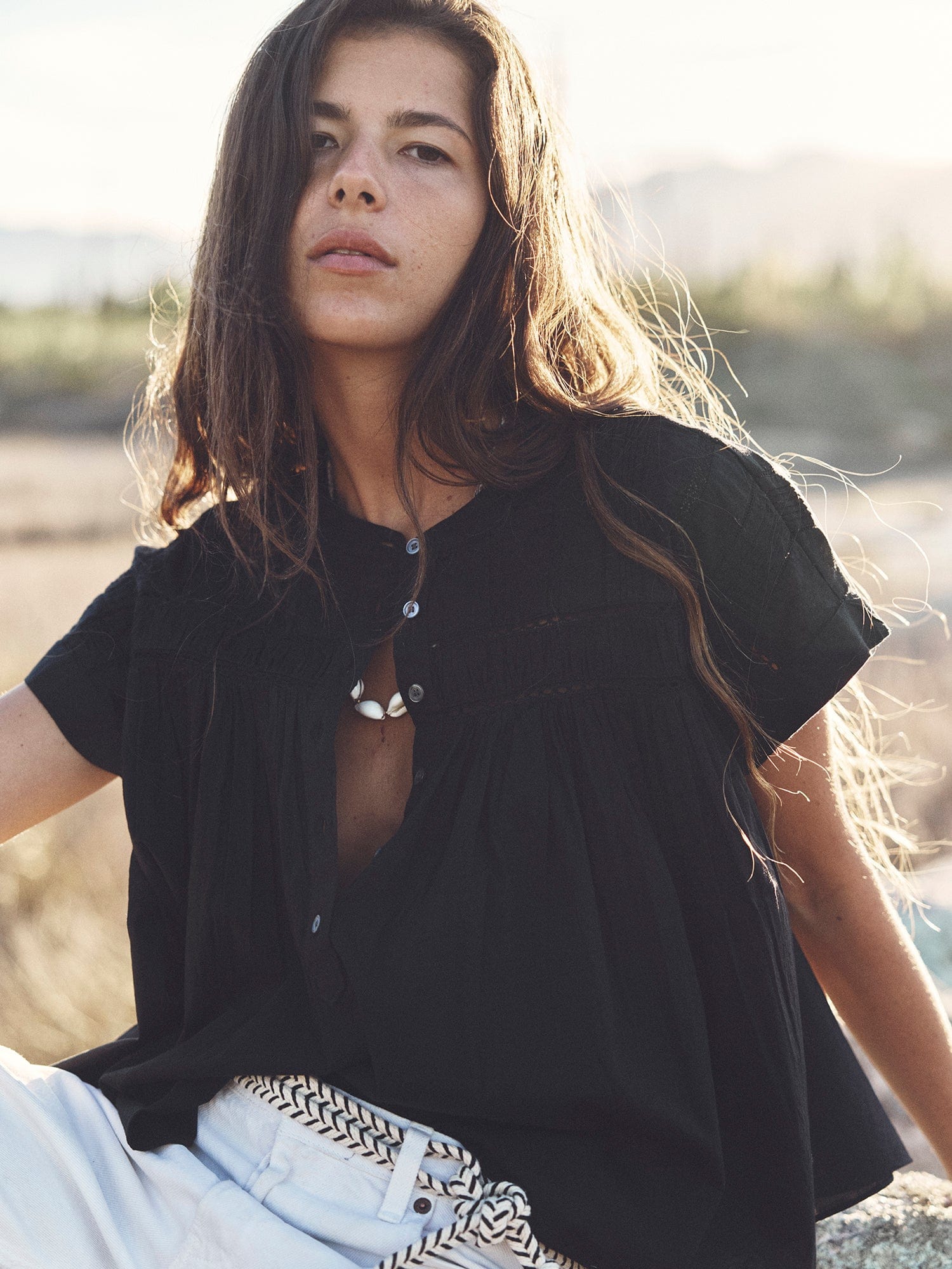 Picture Perfect. Louelle is new this season in our superfine cotton voile with a soft hand. Louelle is a relaxed ultra-femme top with a partial button-front, band collar, pintucks, lace trim, and shirred front and back yokes.