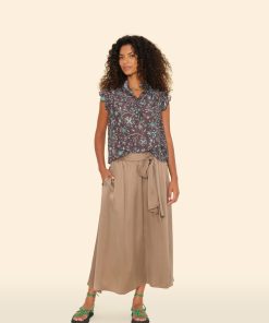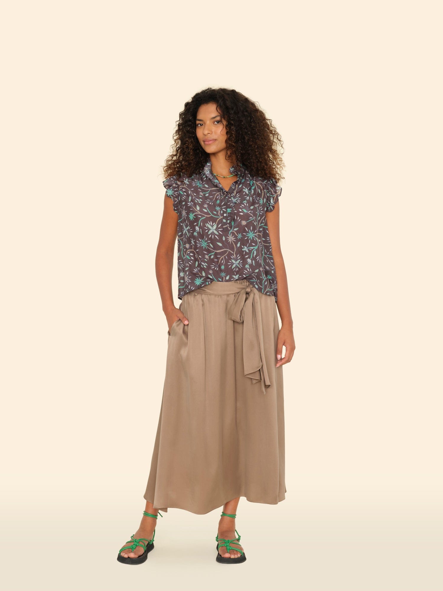 Hidden Gems. Glenda is new this season in our luxe sandwashed silk charmeuse. This elegant pull on skirt features an elasticized waist, attached belt detail, side seam pockets, and a front slit.