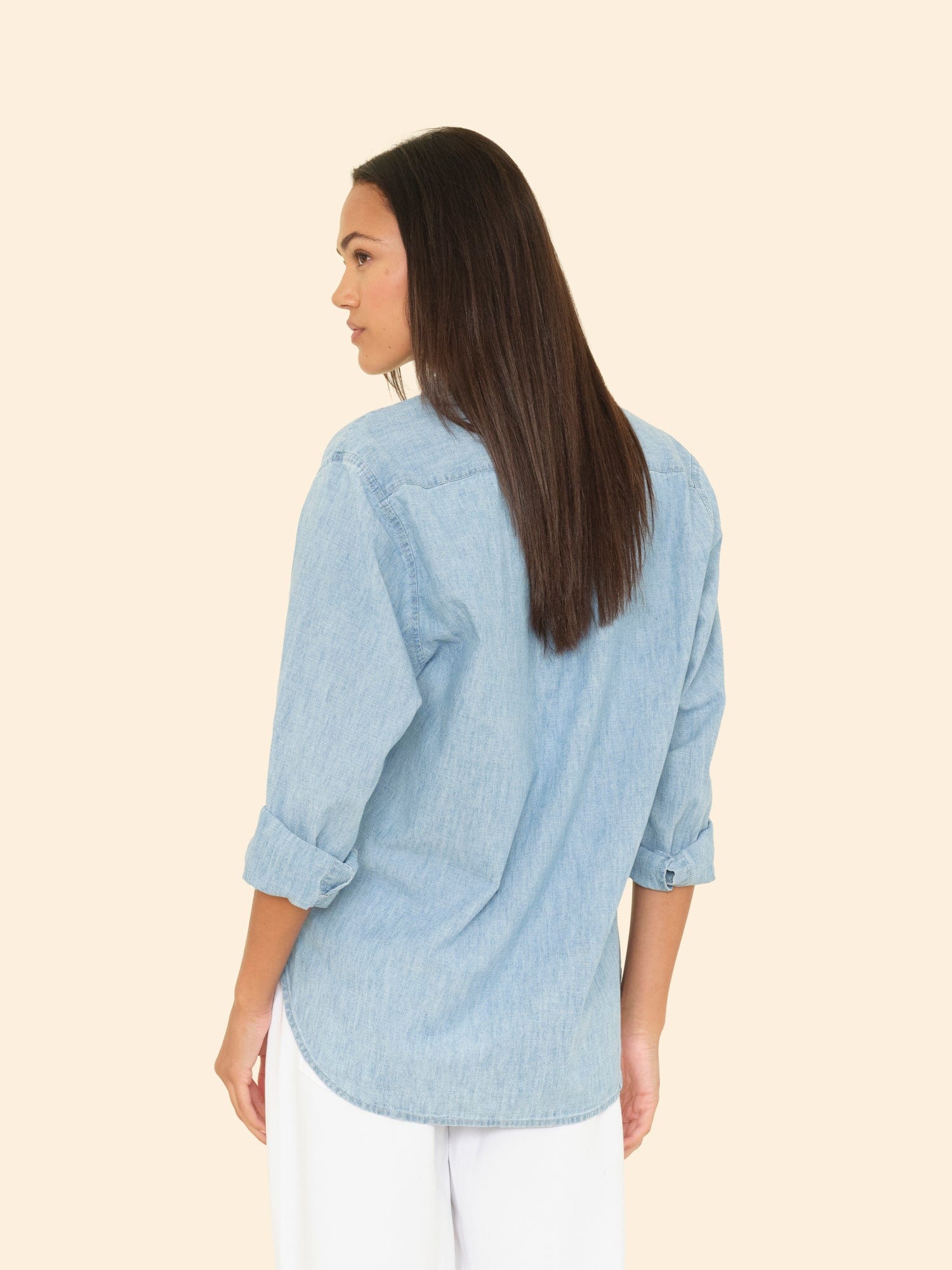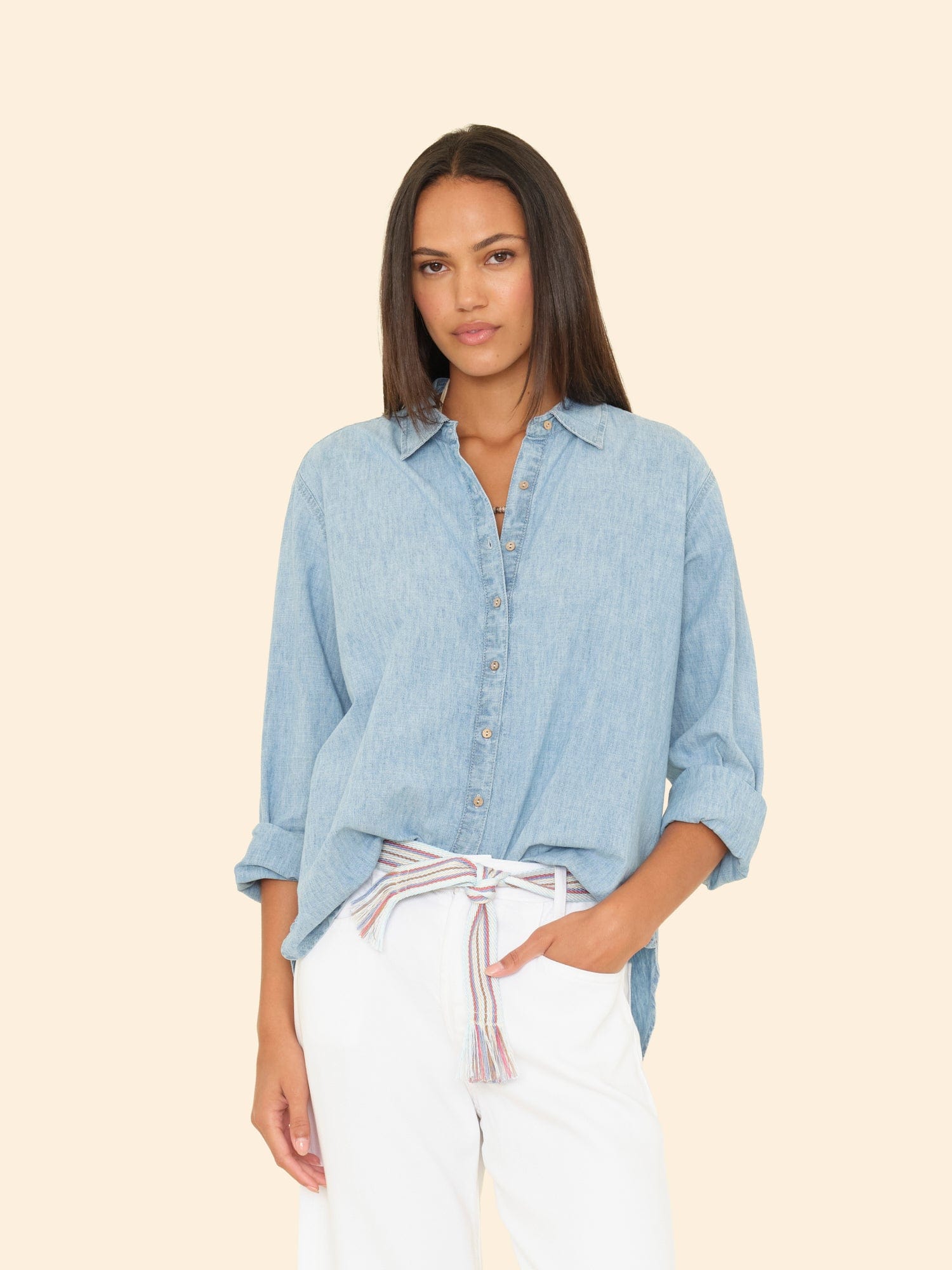 Vacation Mode. Beau is quintessential Xirena and an essential basic. Updated this season in our lightweight, soft-woven cotton chambray in a classic light blue wash, the Beau Shirt has a menswear-inspired shape and is a must-have season after season.