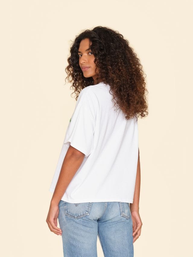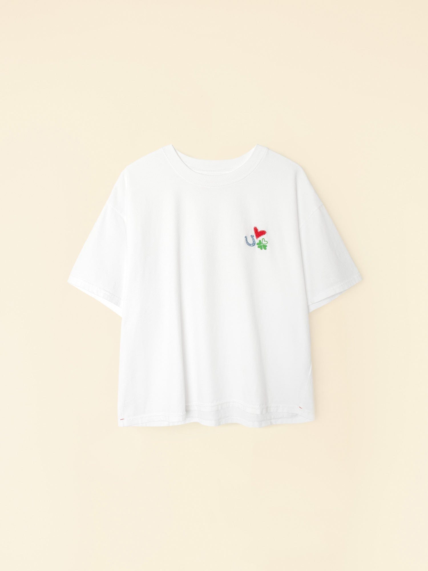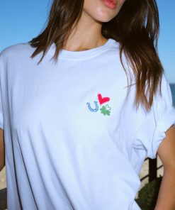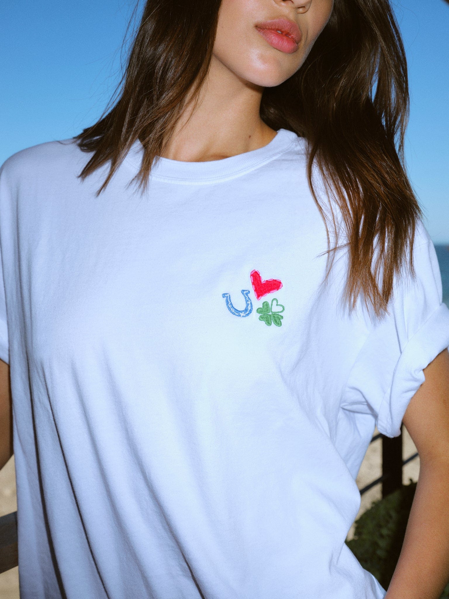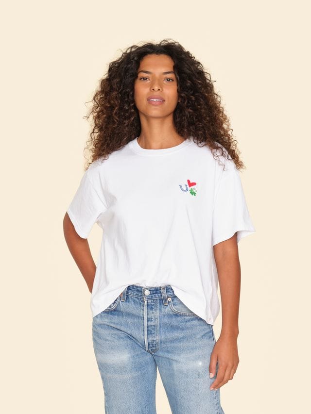 Back to Basics. Palmer is made in our ultra-soft cotton jersey. This limited edition easy wide-sleeve tee has a boxy fit and features an embroidered heart, clover, and horseshoe.