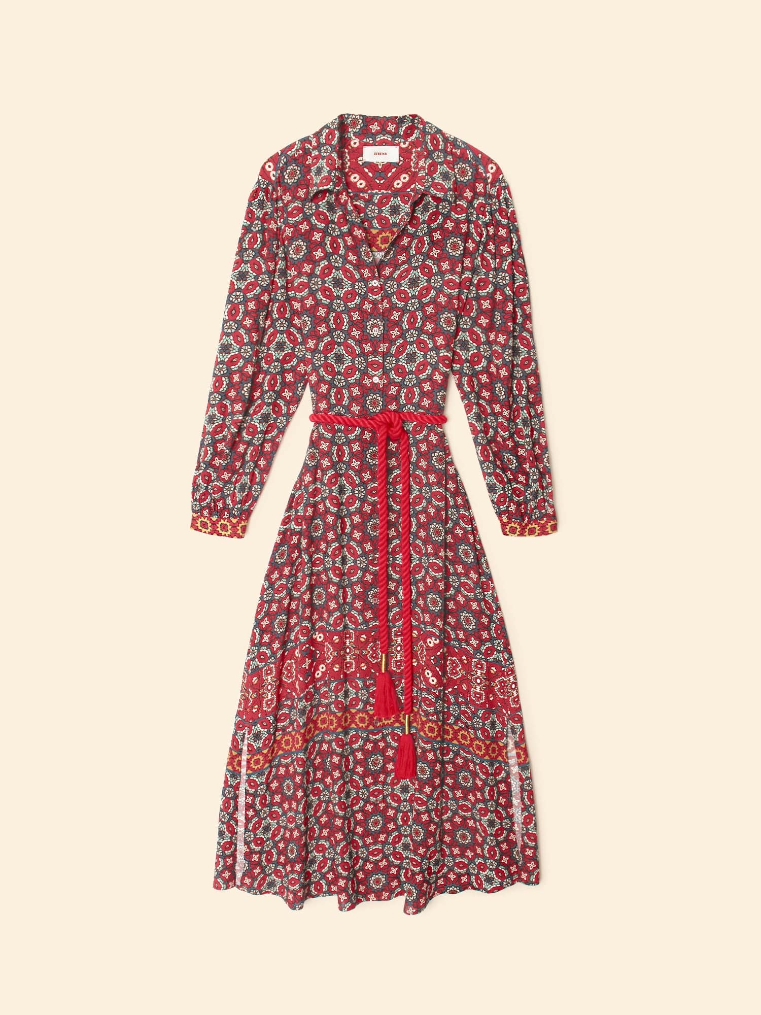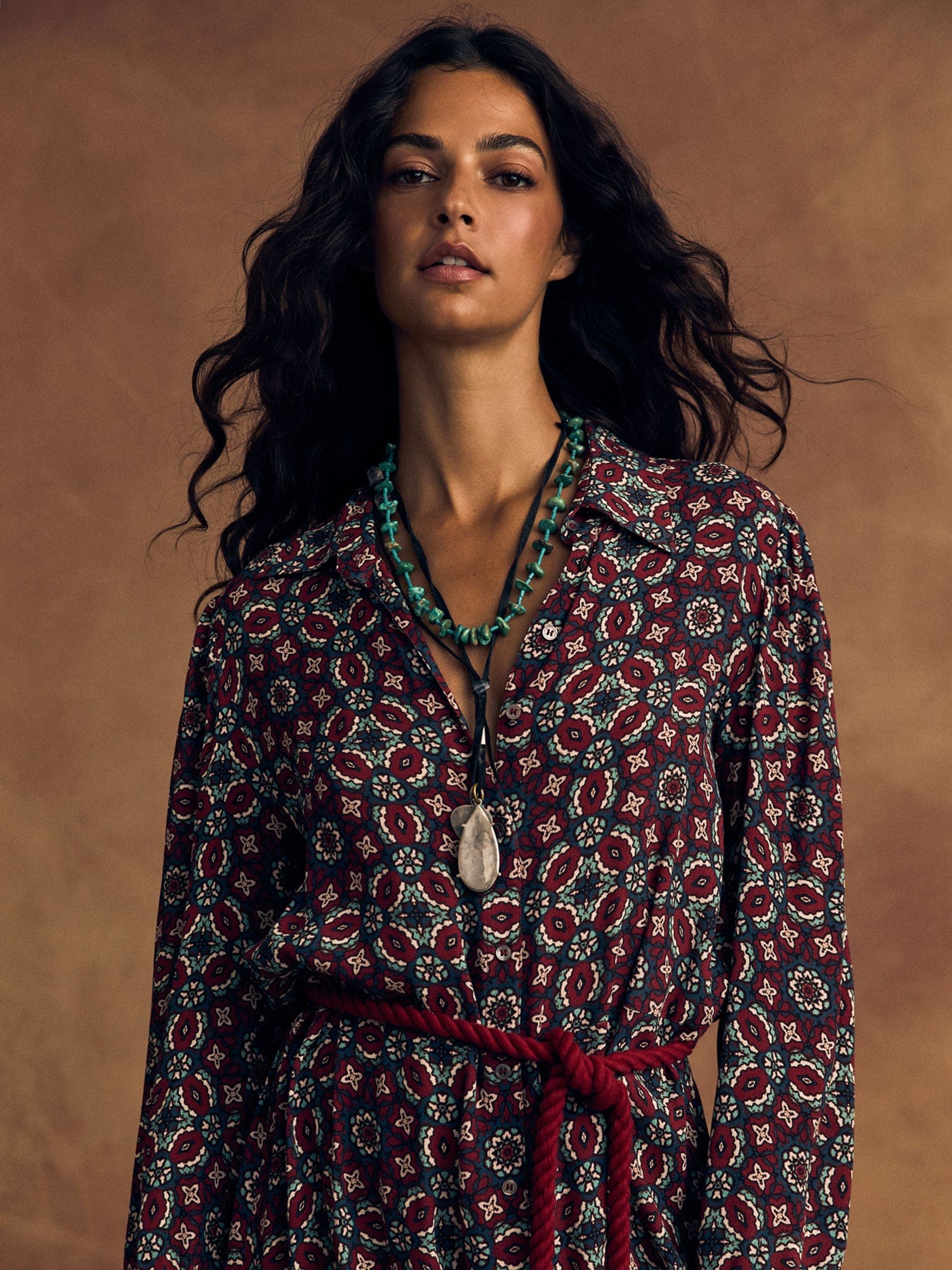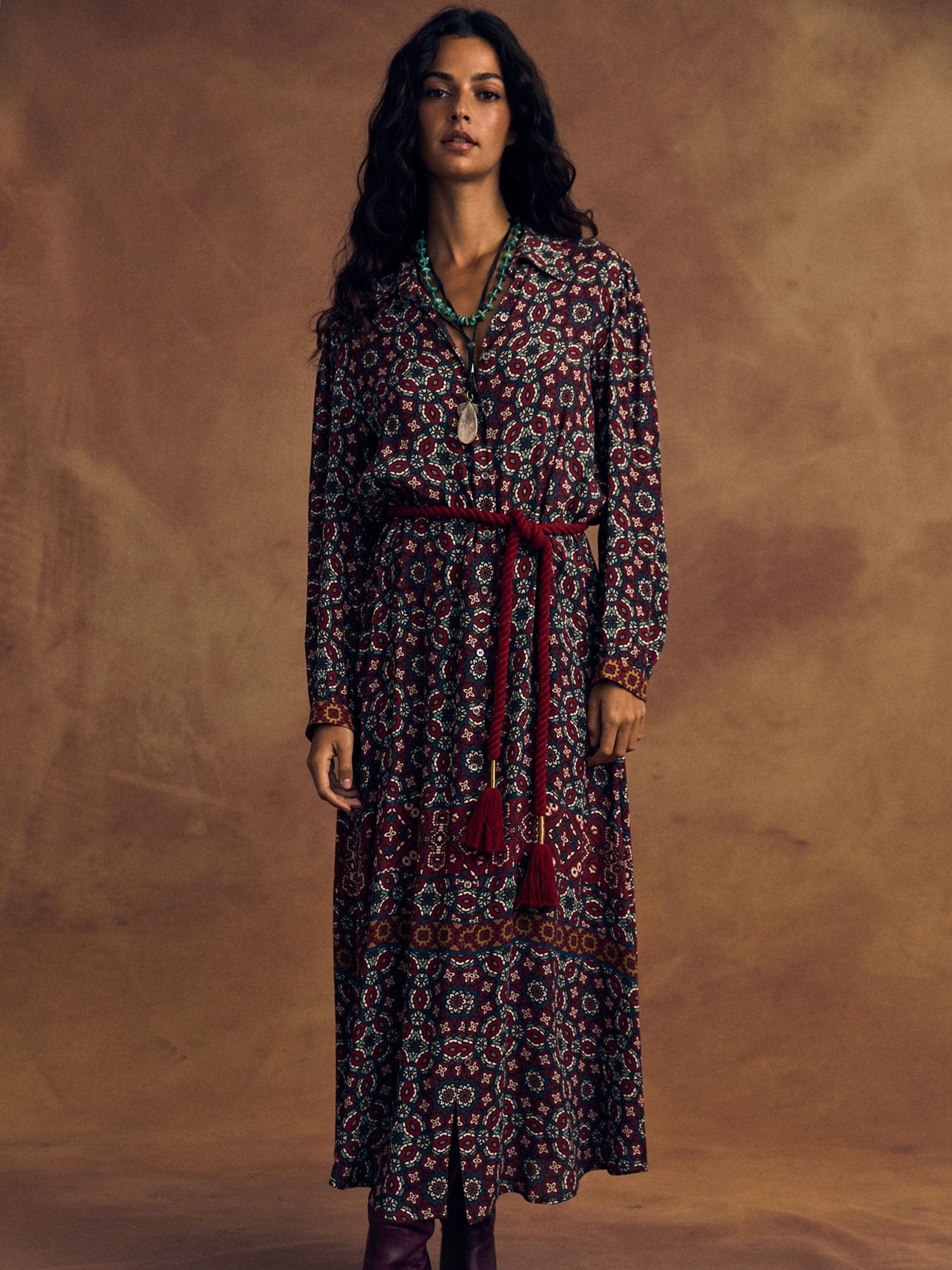 Mosaic Medley. Annabelle is new this season in our mosaic tile print viscose rayon. This button-front midi dress features a shirt collar, blouson sleeves, back yoke, hem side slits, and a braided self-tie belt with fringe.
