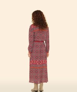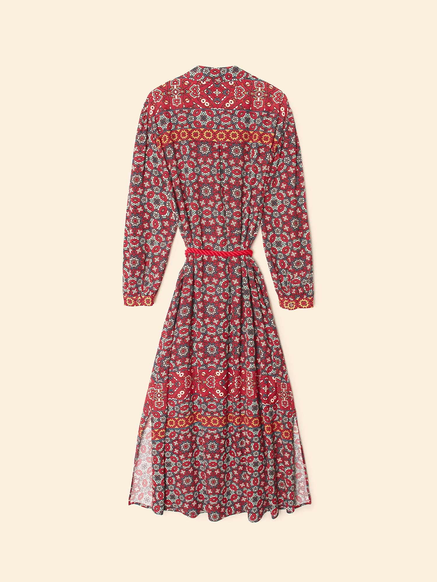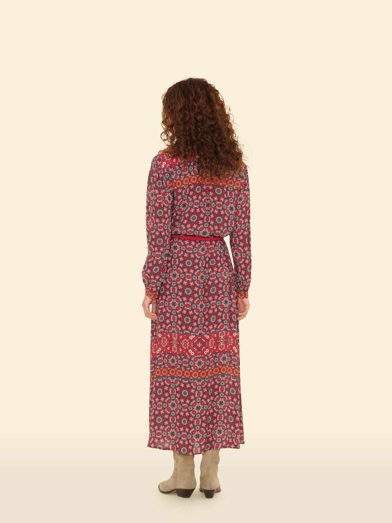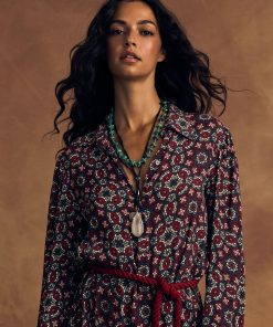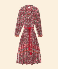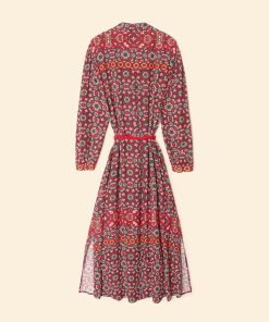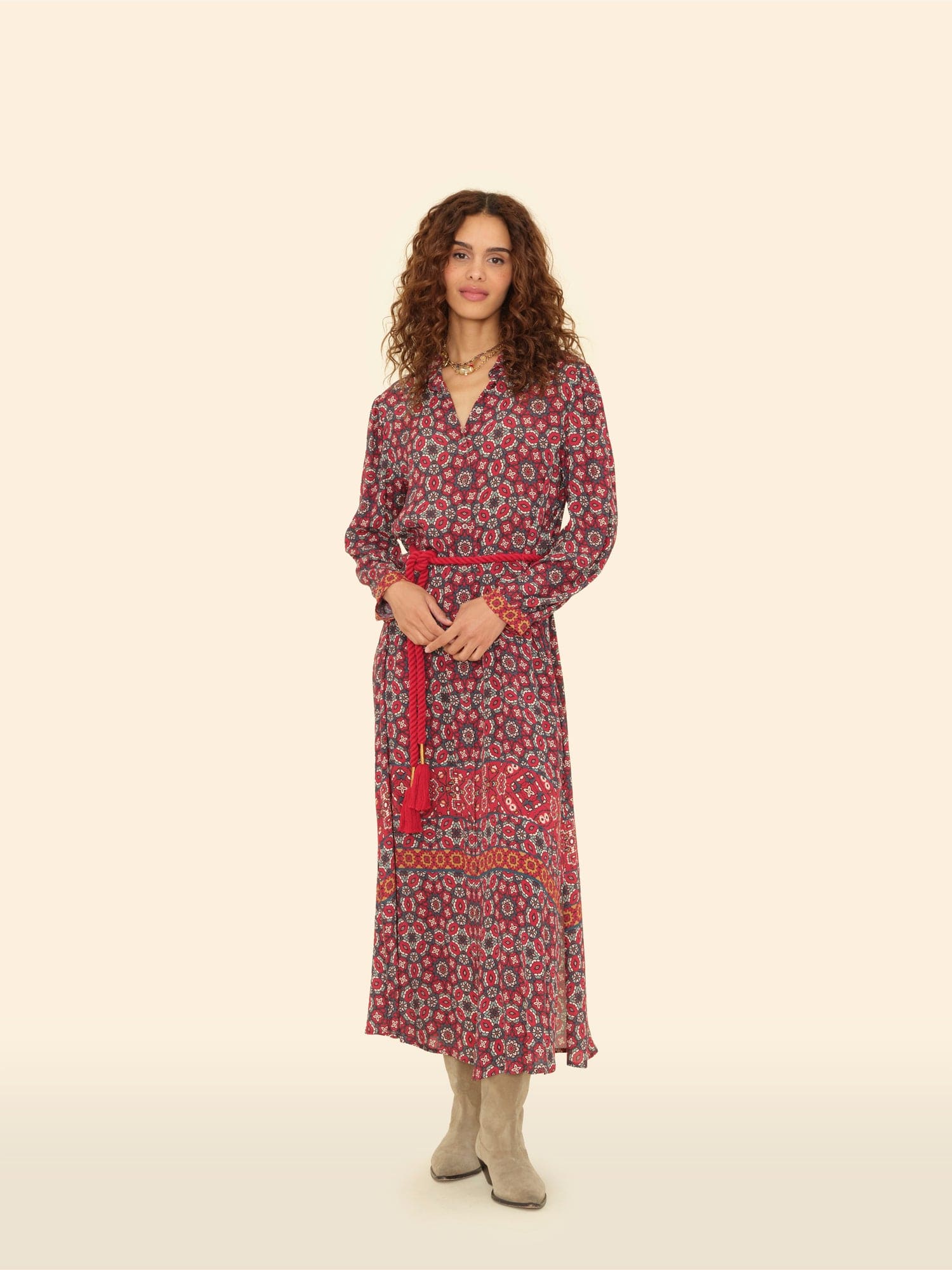 Mosaic Medley. Annabelle is new this season in our mosaic tile print viscose rayon. This button-front midi dress features a shirt collar, blouson sleeves, back yoke, hem side slits, and a braided self-tie belt with fringe.