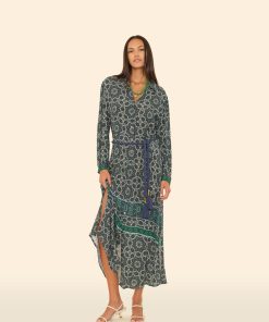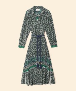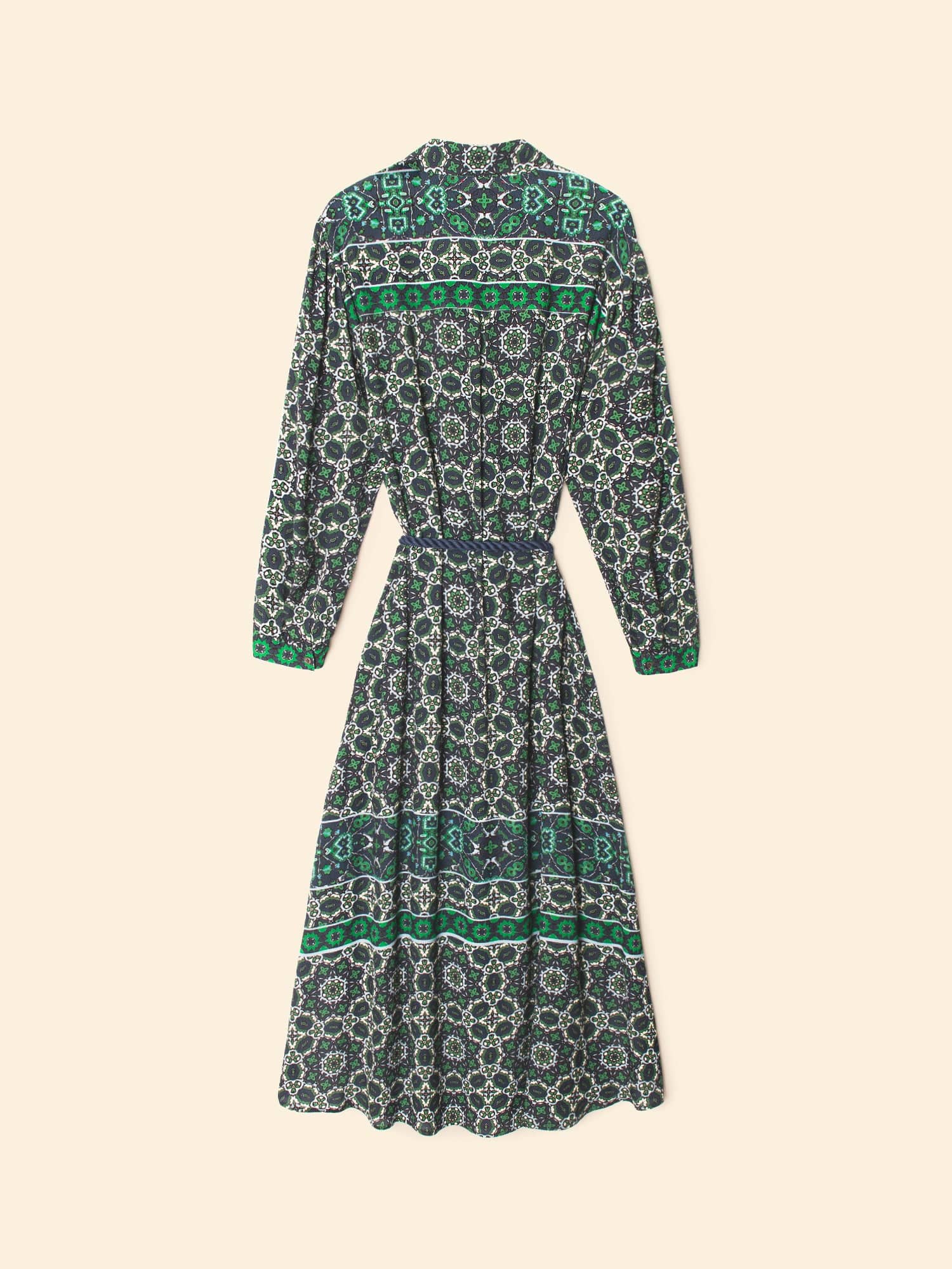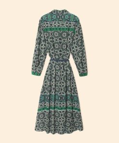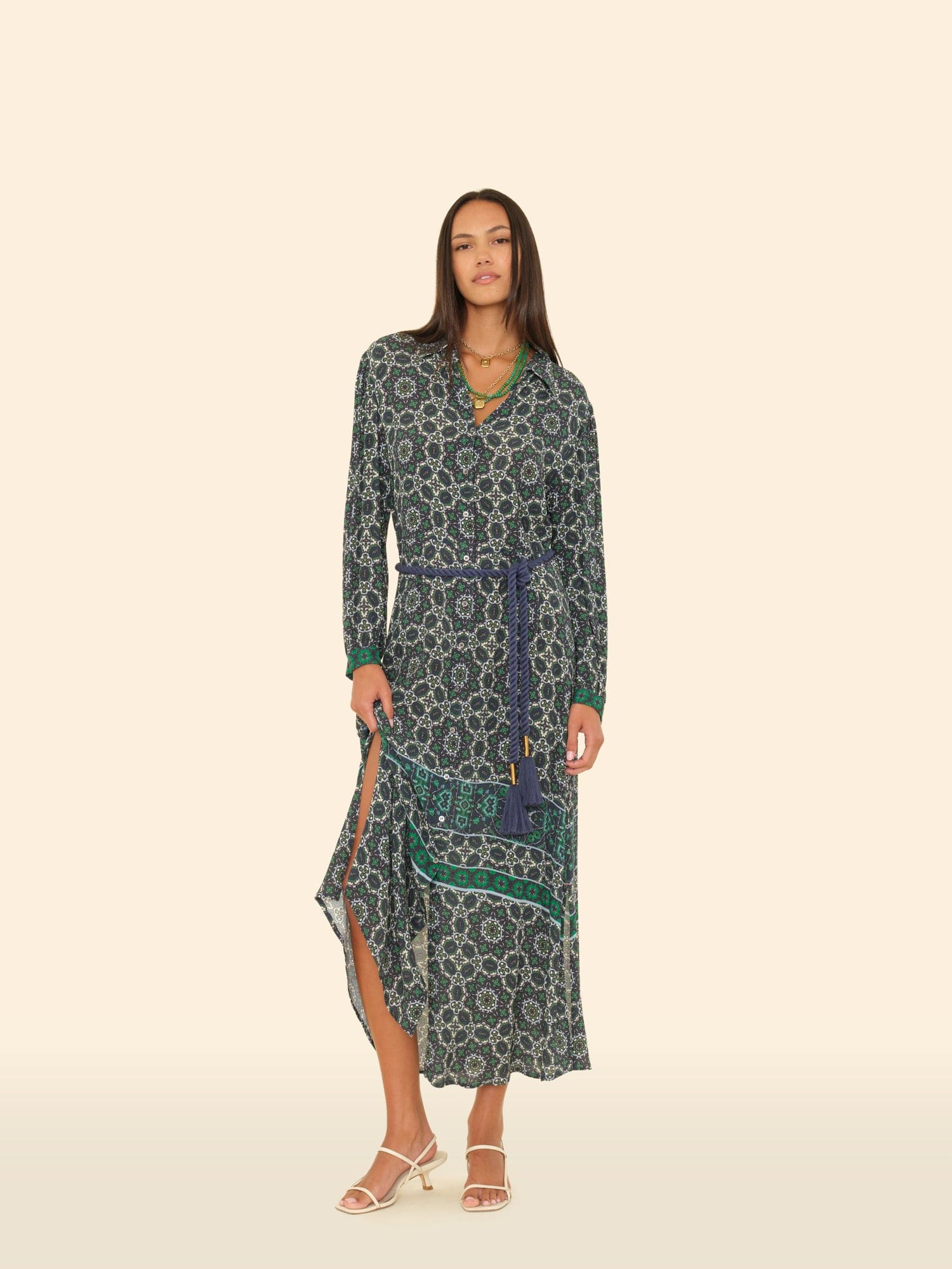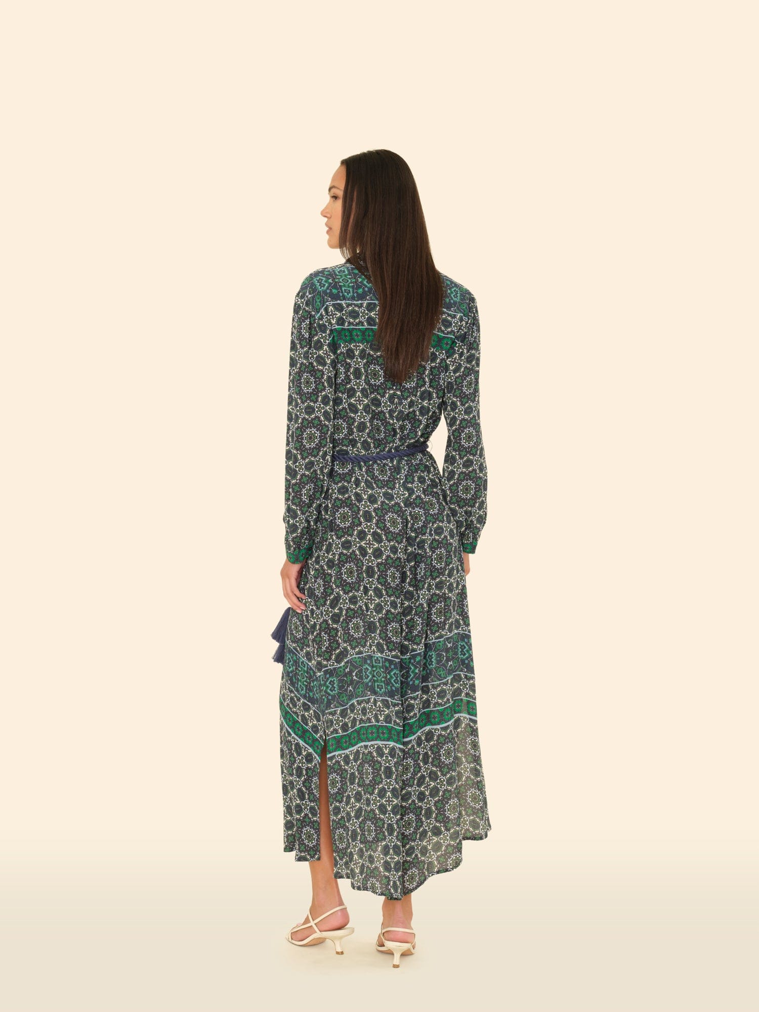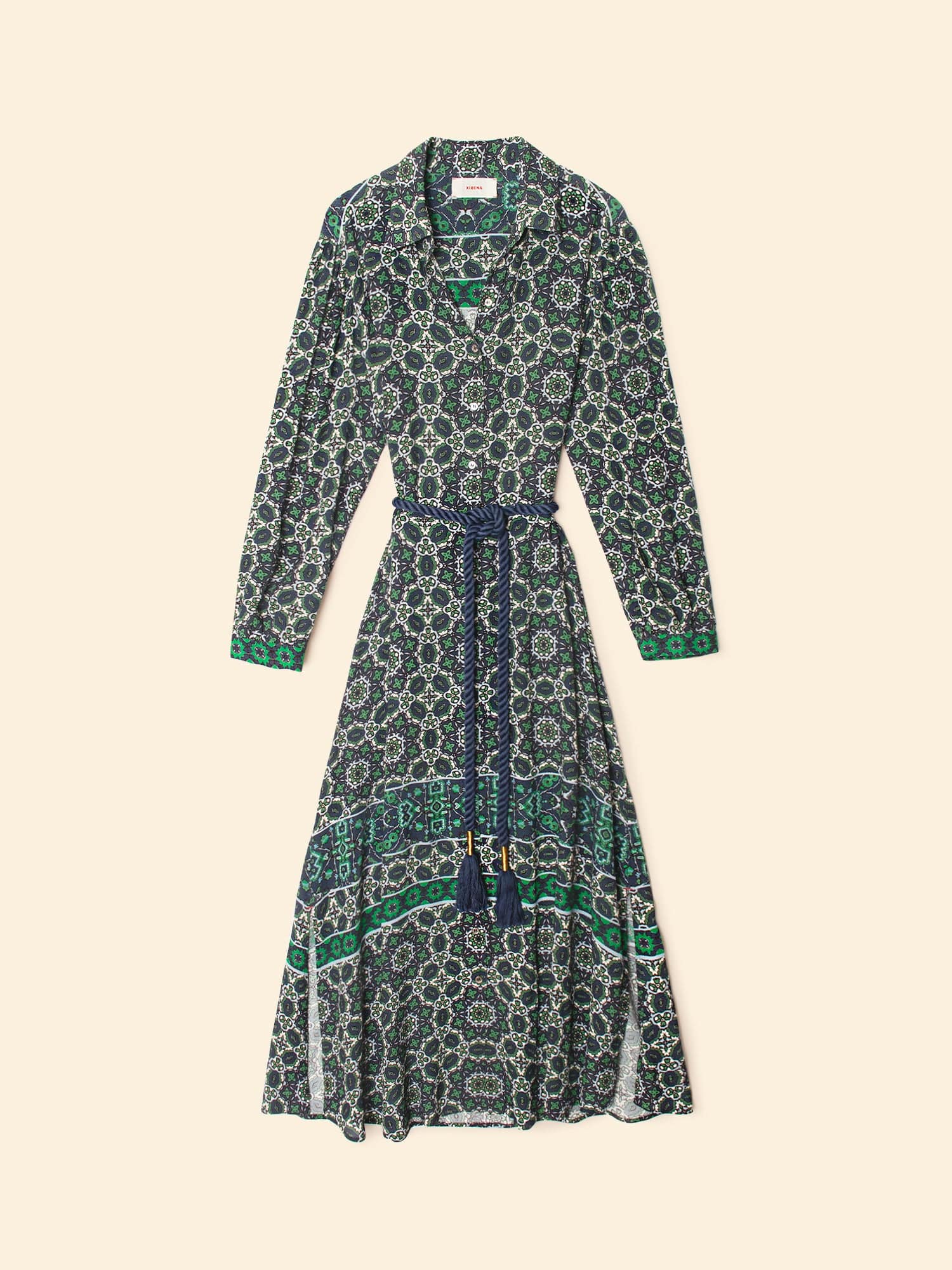 Mosaic Medley. Annabelle is new this season in our mosaic tile print viscose rayon. This button-front midi dress features a shirt collar, blouson sleeves, back yoke, hem side slits, and a braided self-tie belt with fringe.