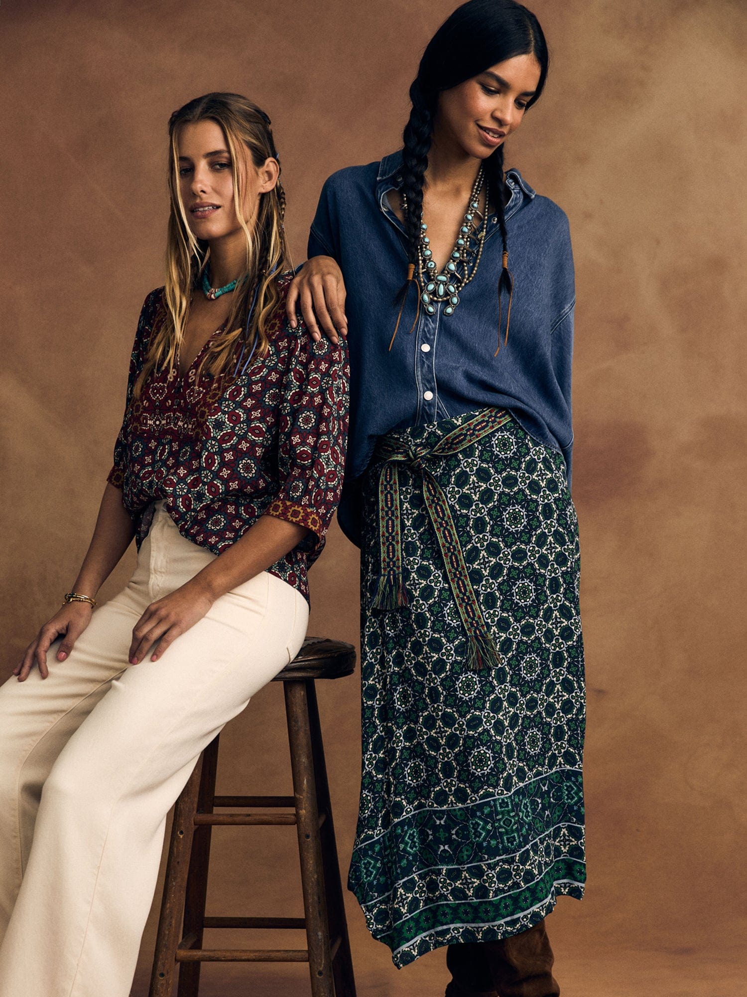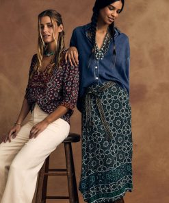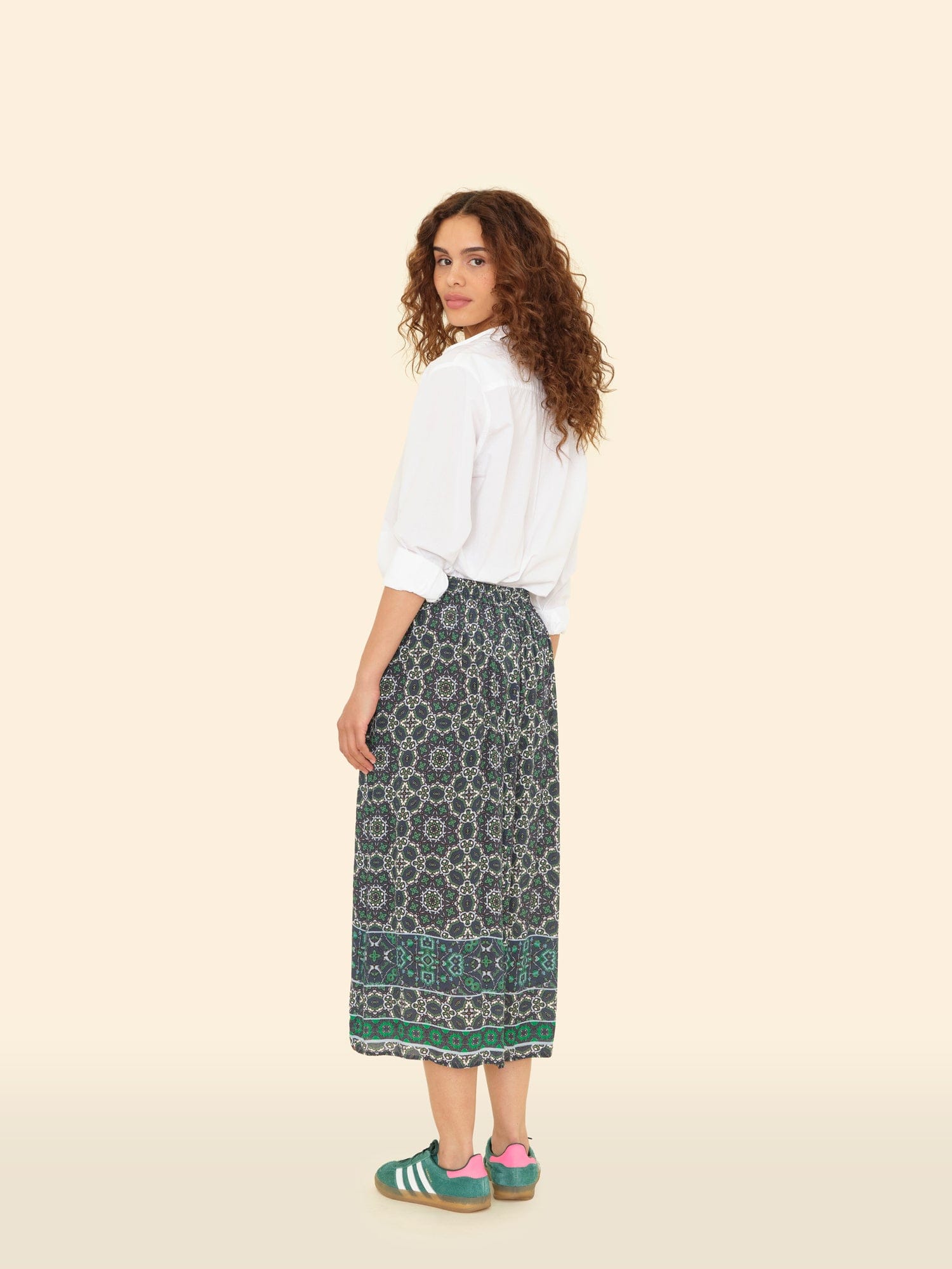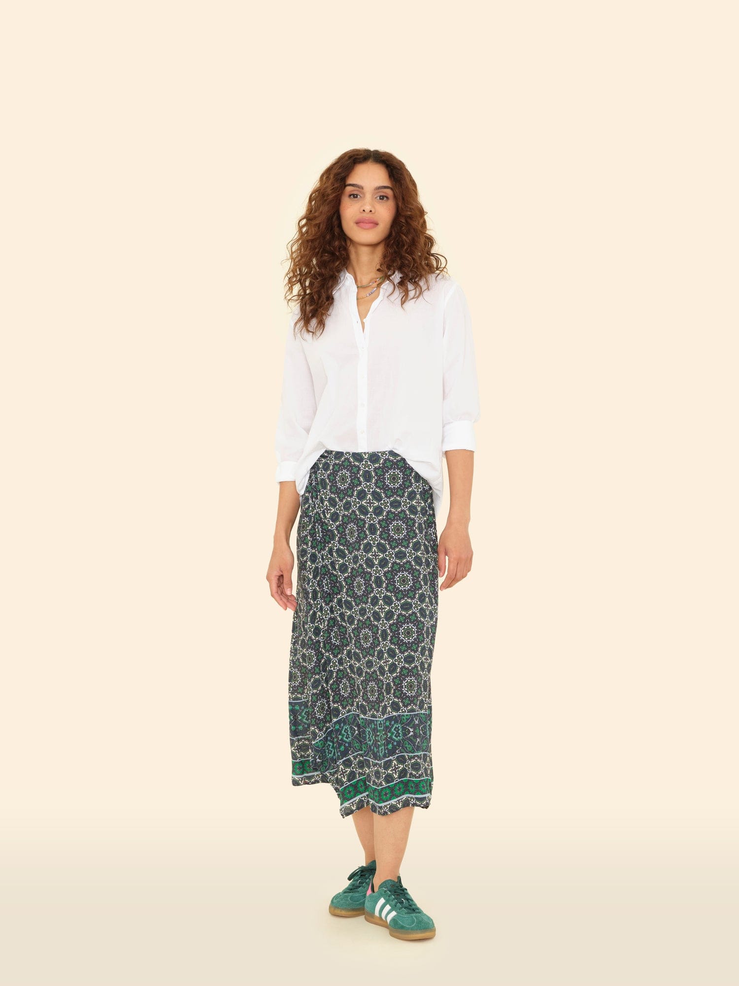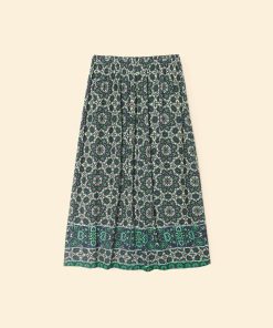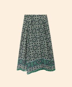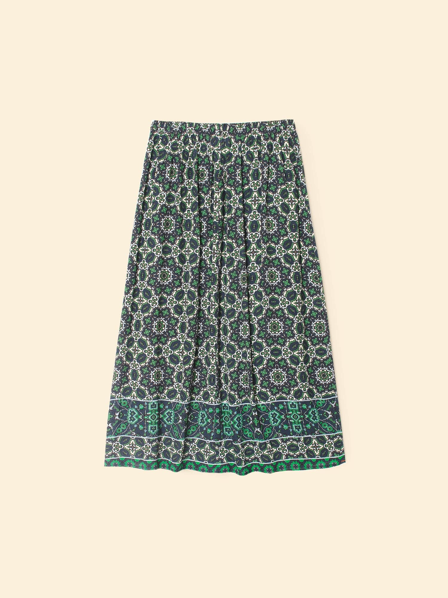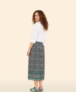 Mosaic Medley. Yana is new this season in our mosaic tile print viscose rayon. This faux wrap skirt features an elasticized back waist.