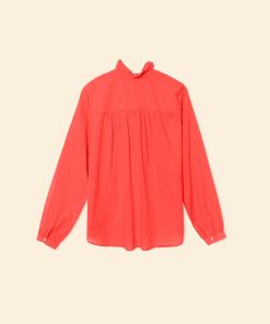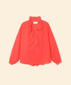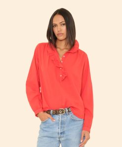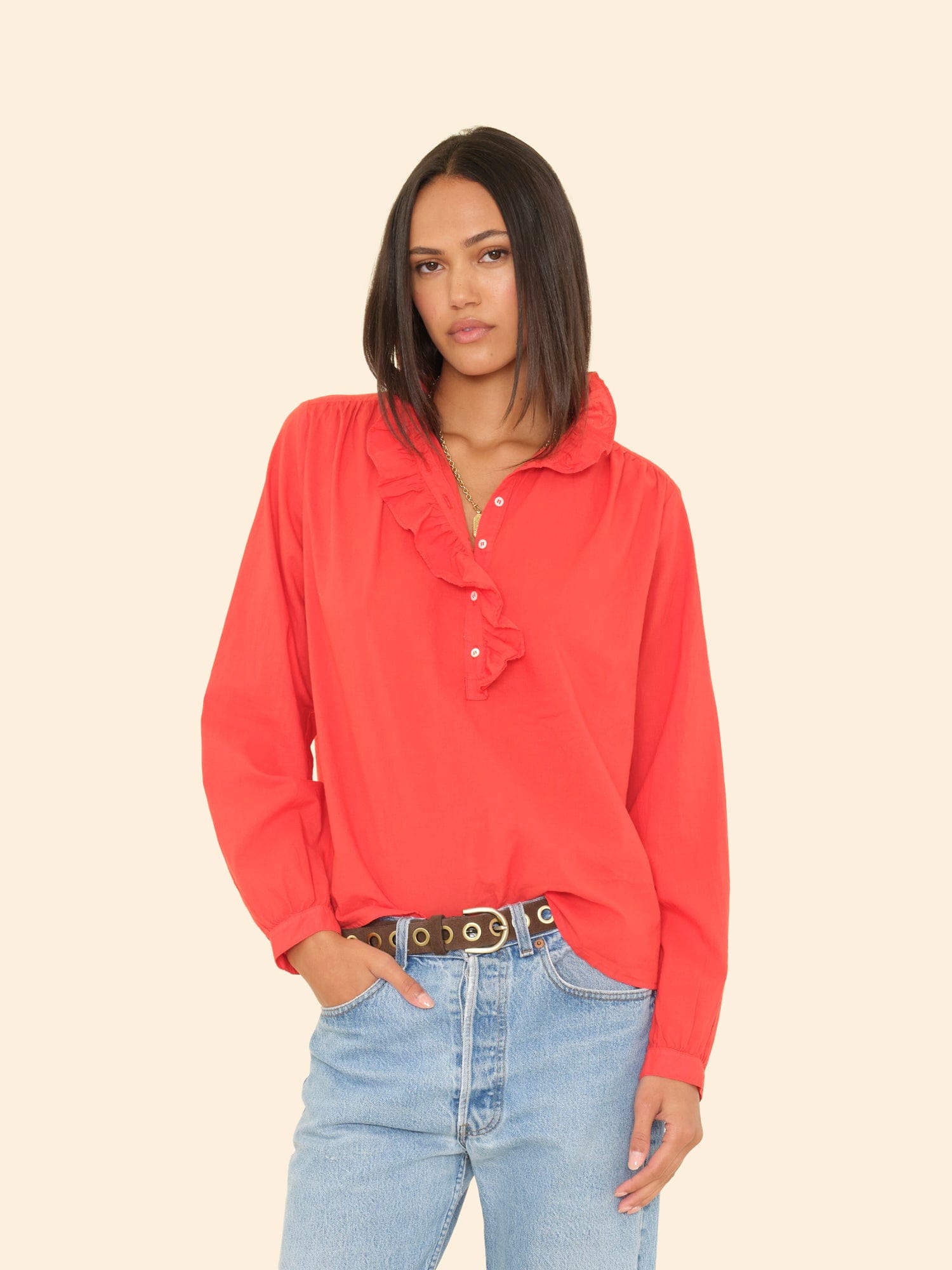 For the Frill of it. Caspian is made in our classic lightweight woven cotton poplin for a lived-in look and feel. Caspian is a ruffle henley with ruffle details all throughout the neck and front placket. This elevated henley also has shirring at the sleeves, front, and back and a high low hem.