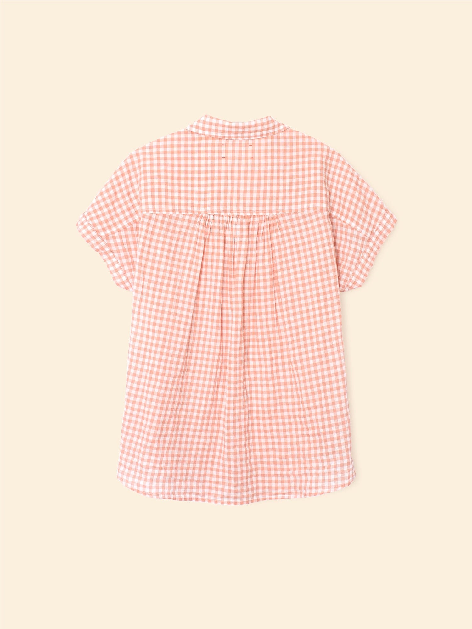 Checkmate. Paxton is updated this season in our cotton gingham check with added stretch for ease of comfort. This short sleeve shirt features a button-front, cap sleeves, shirred shoulder and back yokes, and a high low shirttail hem.
