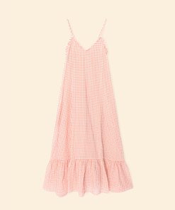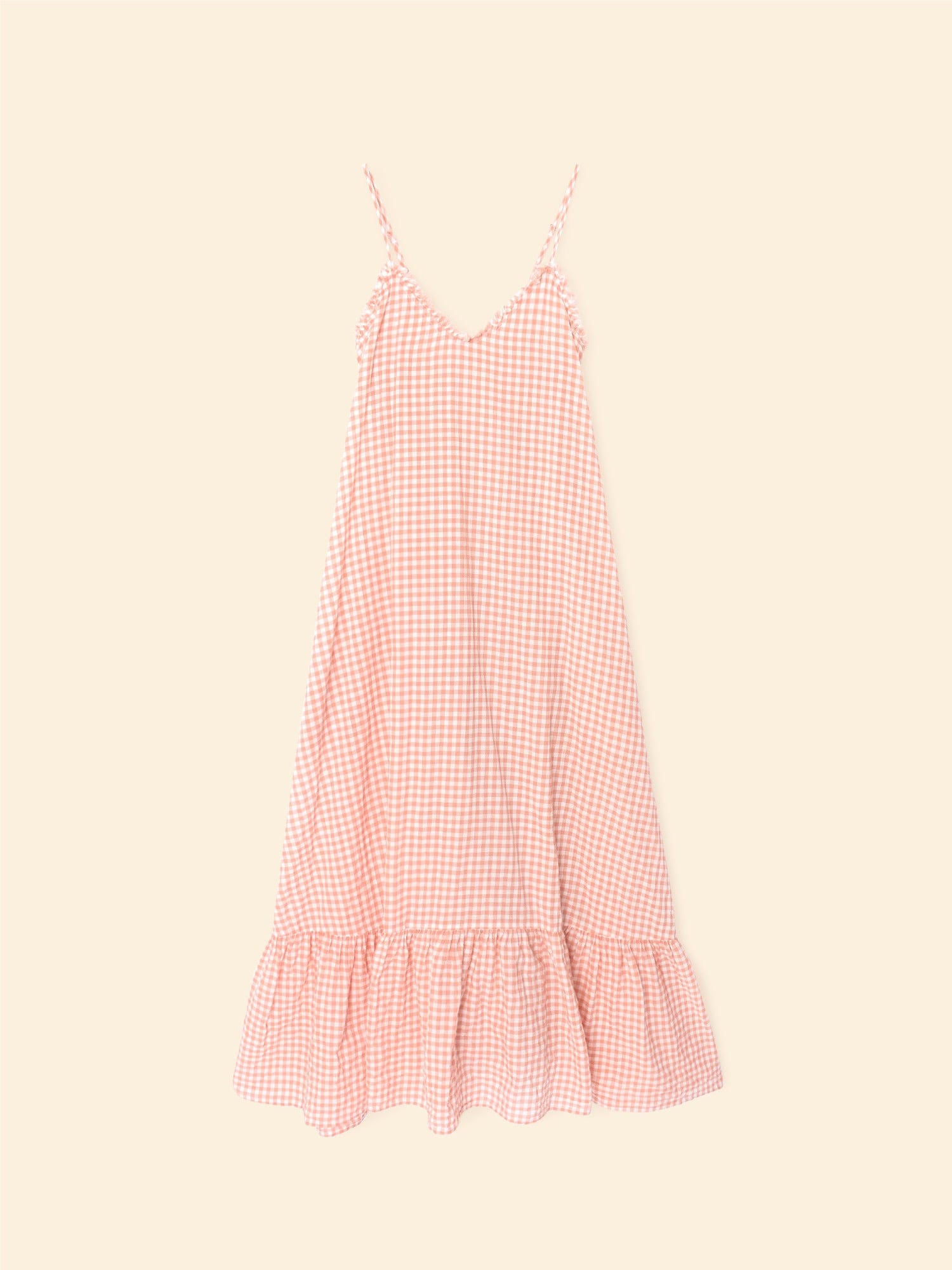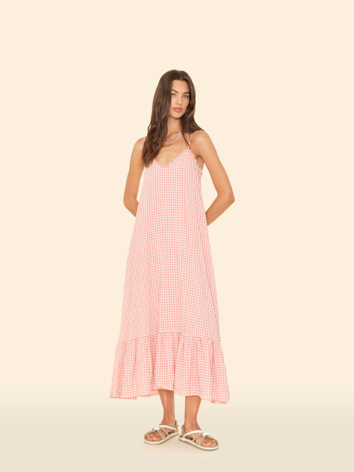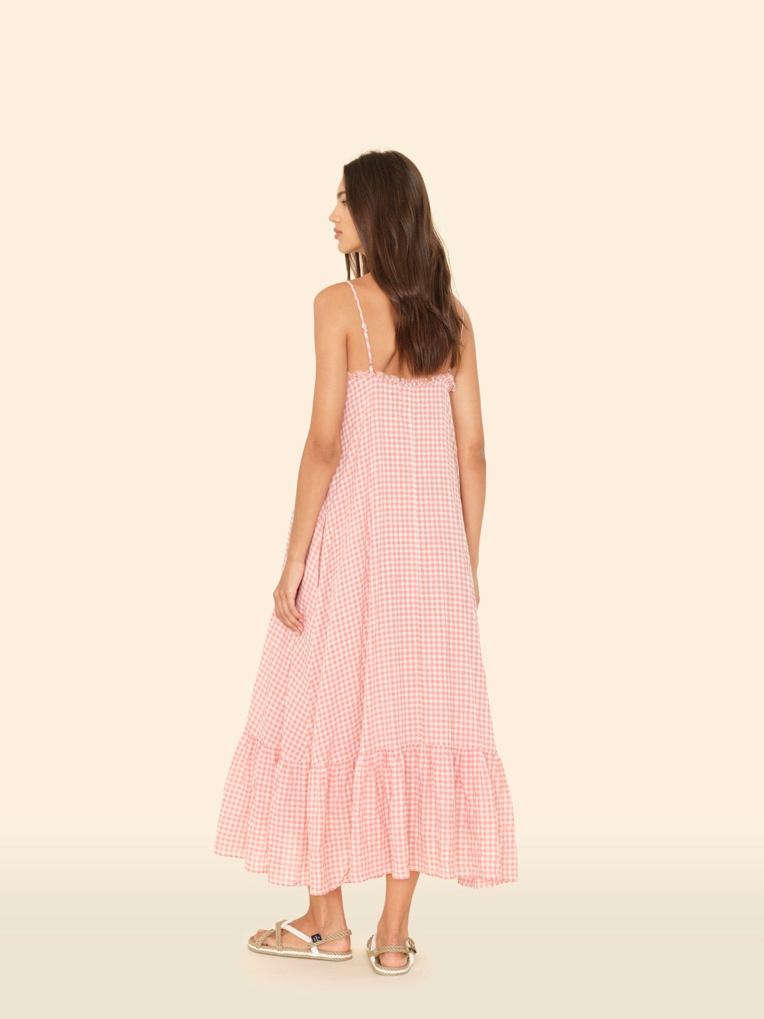Checkmate. Taytum is new this season in our cotton gingham check with added stretch for ease of comfort. This fully lined midi dress features a tiered skirt, spaghetti straps, side seam pockets, and a raw edge ruffle hem.