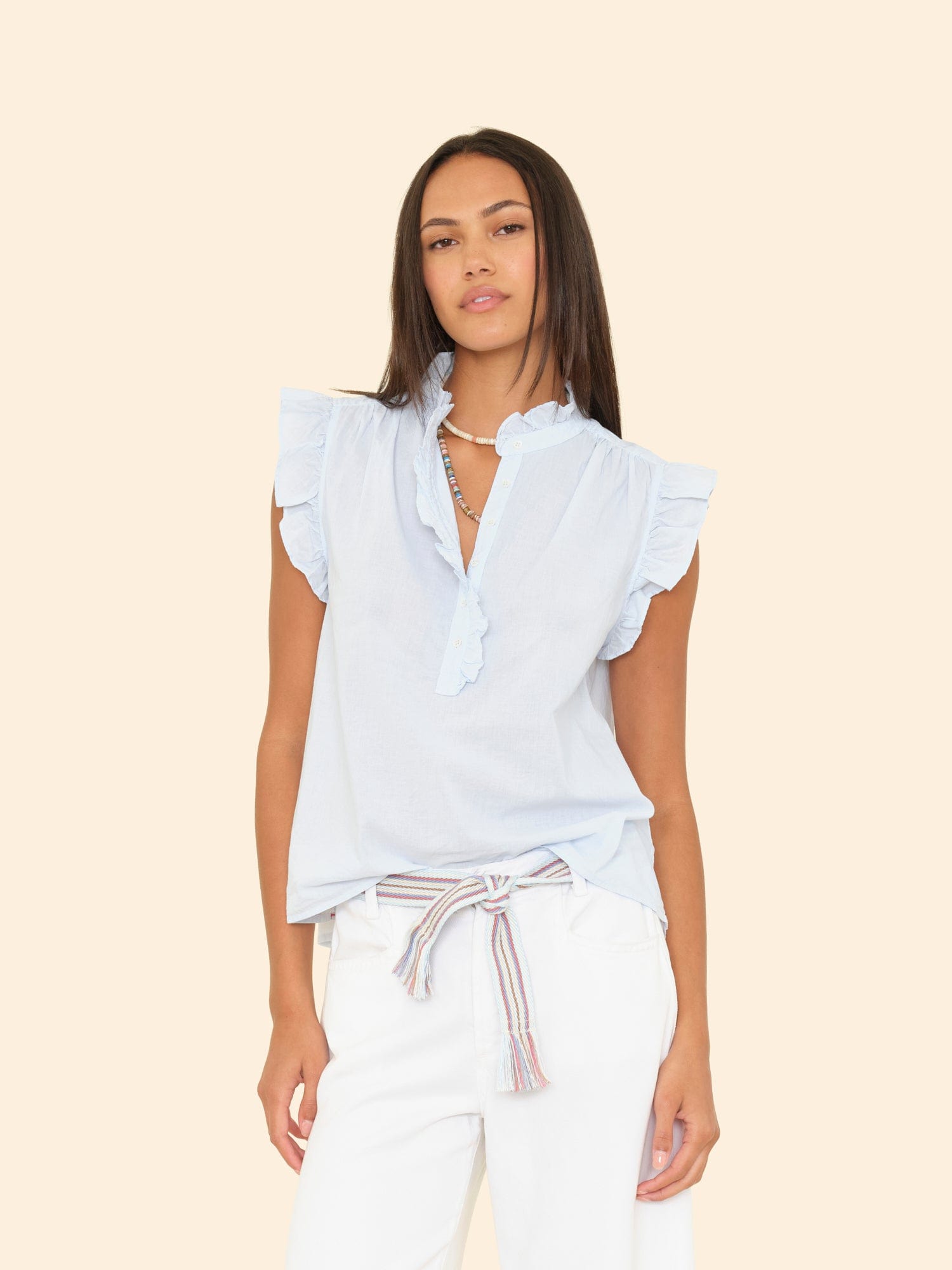 Picture Perfect. Brenna is new this season in our classic lightweight woven cotton poplin for a lived-in look and feel. Brenna combines all of our favorite elements from our bestselling Caspian and Bex tops with its ruffle details throughout the neck, front placket, and sleeves. This relaxed button-front top also features a band collar and ruched back yoke.