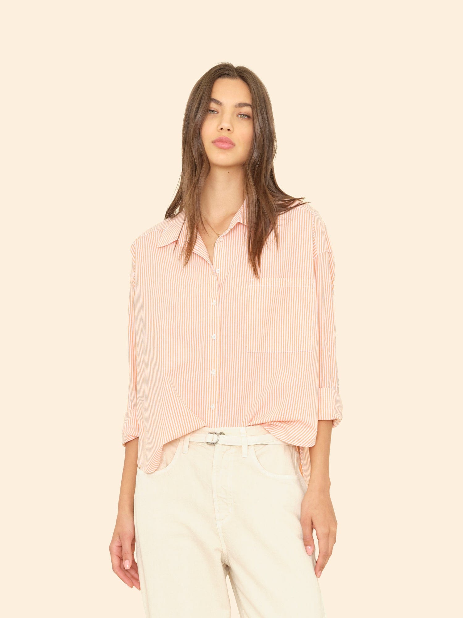 Earn your stripes. Jordy is updated this season in our crisp cotton pencil stripe. Jordy is an easy button-front shirt with a boxy fit, left chest pocket, and high low shirttail hem.