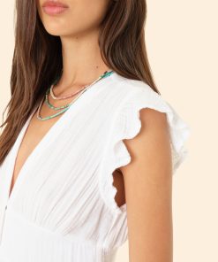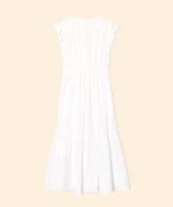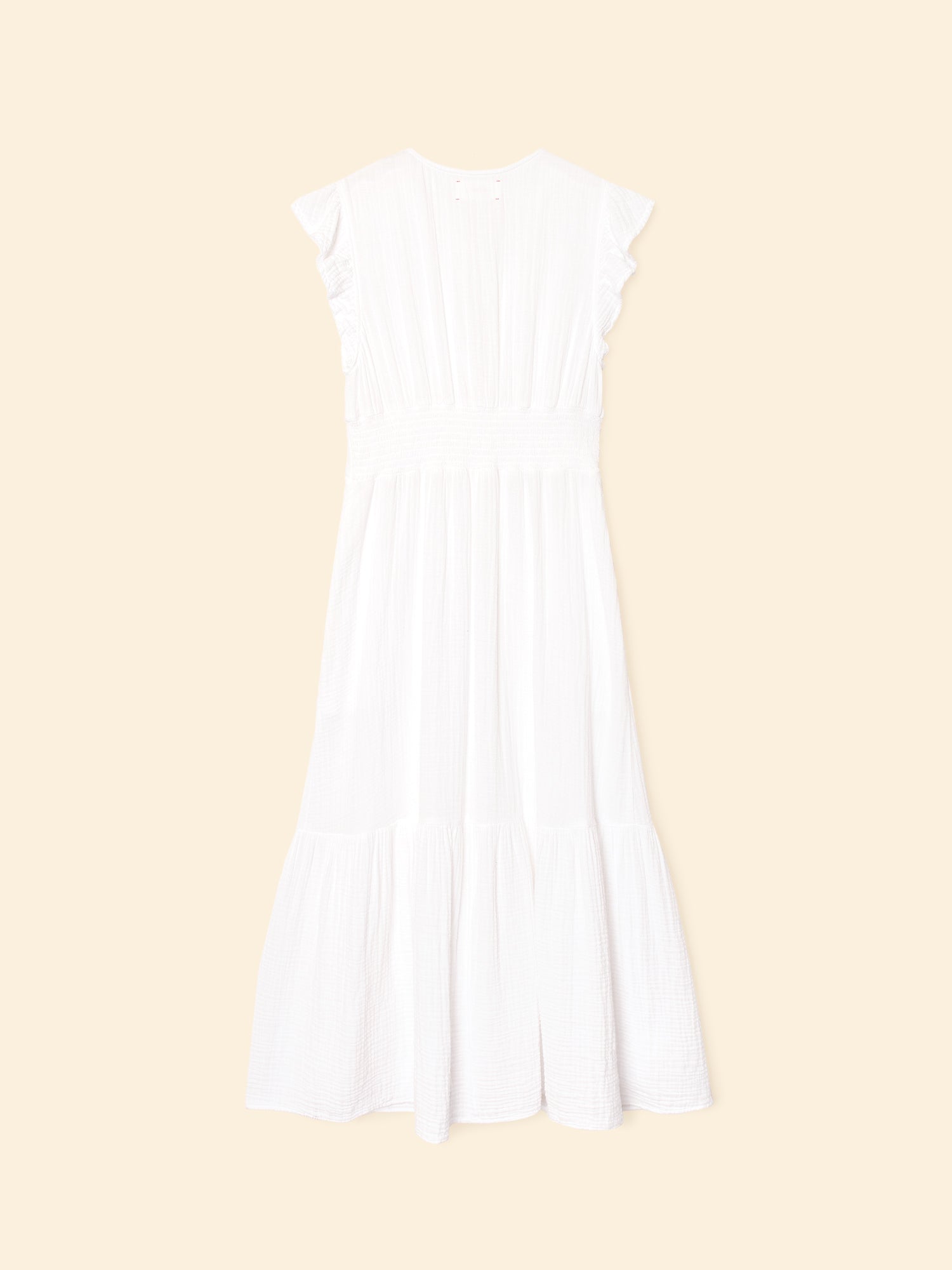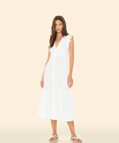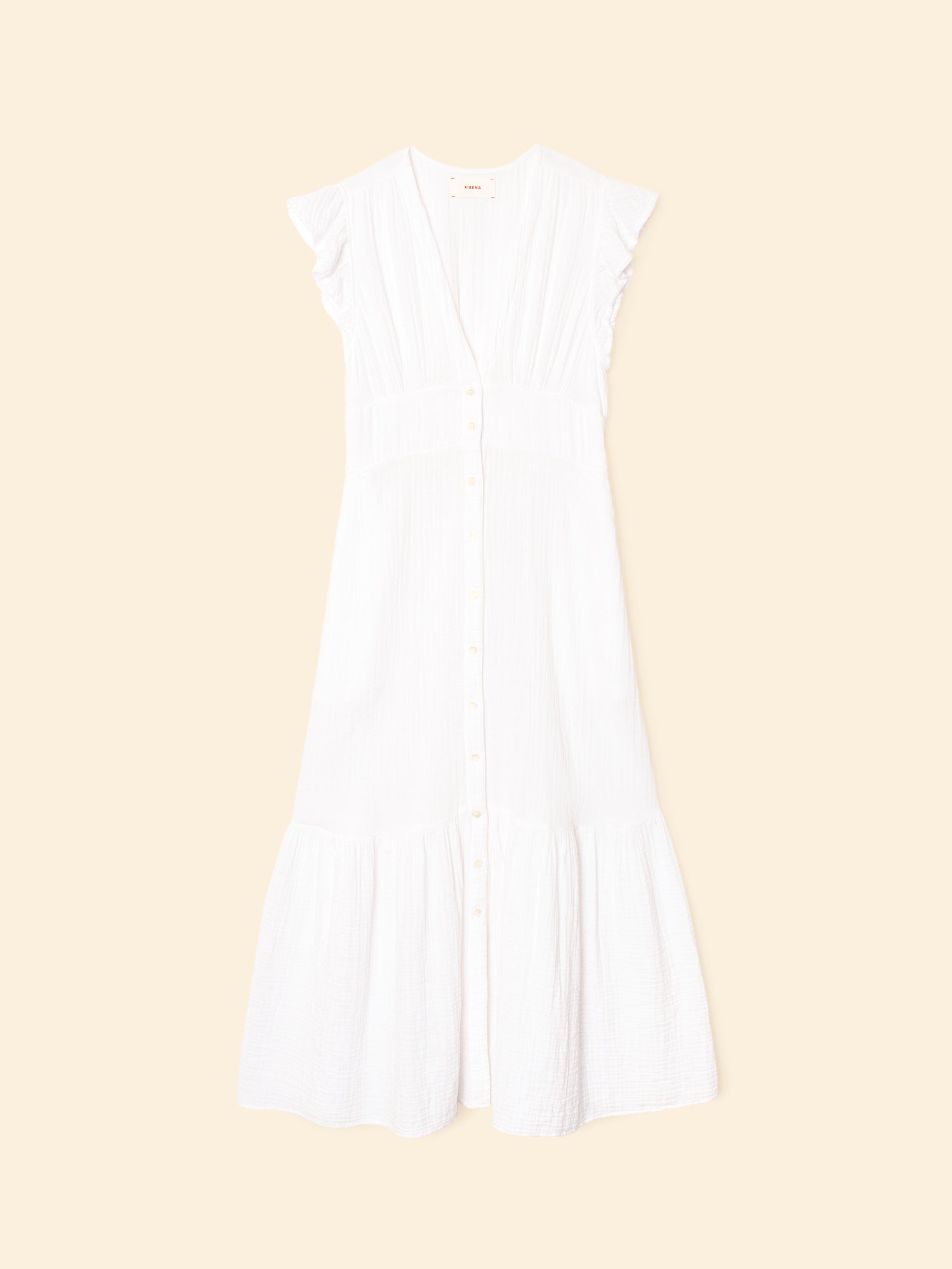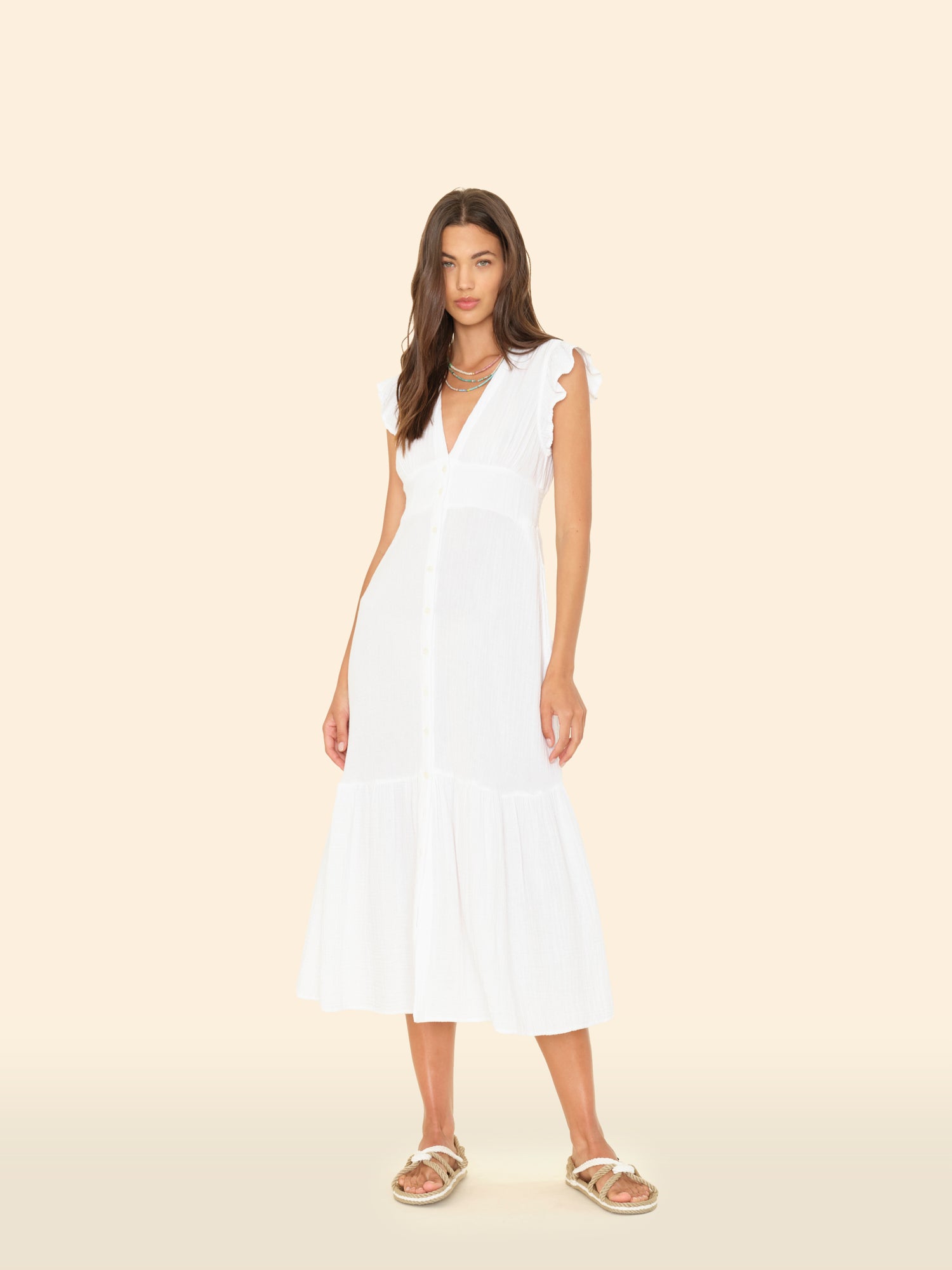 Pretty Please. Davana is new this season in our washed double faced cotton gauze for a soft, gently crinkled feel. This button-front midi dress features a V-neck, ruffle sleeves, side seam pockets, and a flounce ruffle hem.