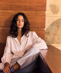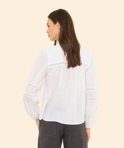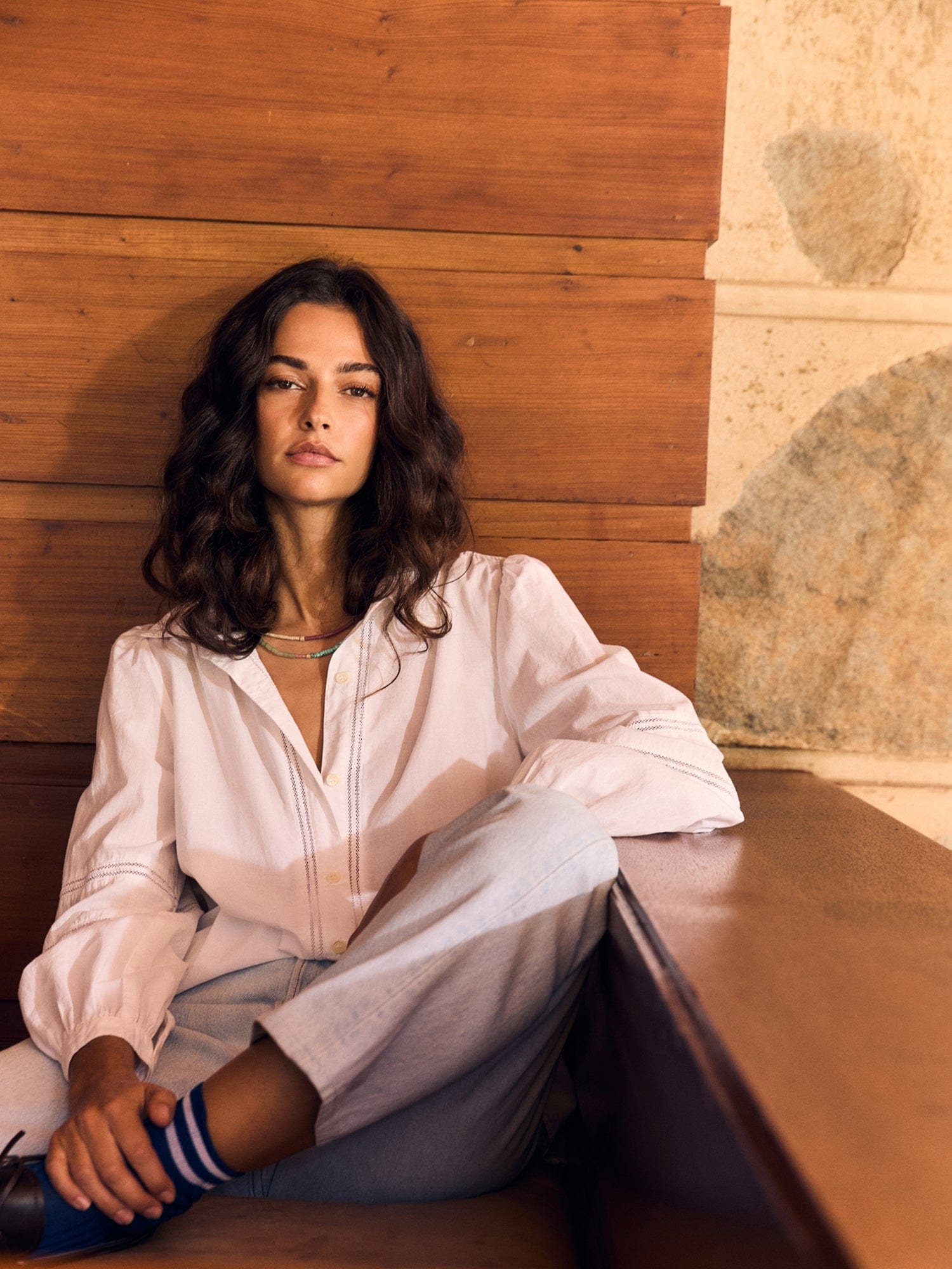 It’s all in the details. Renata is new this season in our classic lightweight woven cotton poplin for a lived-in look and feel. This femme button-front shirt features lattice trim details, blouson sleeves, and a shirred back yoke.